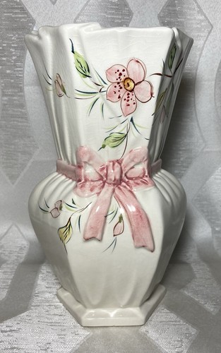 Beautiful vintage ceramic vase made in Italy, featuring delicate hand-painted style floral designs and a raised pink bow detail. This piece has a soft, romantic aesthetic with a shabby chic / cottagecore feel. The sculpted shape and textured glaze add depth and character, making it a lovely decorative accent for any space. Details: • Height: Approx. 9 inches • Width: Approx. 5 inches • Origin: Made in Italy (original sticker present) • Material: Ceramic • Design: Floral with pink bow accent Condition: Excellent pre-owned condition. No chips, cracks, or repairs. Clean and well cared for. Light age-appropriate wear on the base.