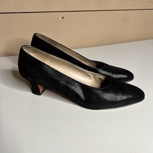 Textured black leather uppers show light surface scuffing, mild creasing, and a few rubbed spots at the toes and heel counters. Leather insoles display discoloration, creasing, and worn patches at the heel lining, and leather outsoles show noticeable scuffing at the forefoot and heel; shoes are sold as pictured without original box or accessories.