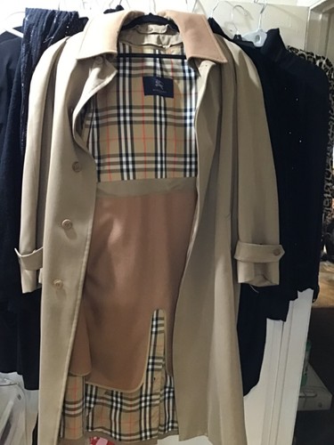 It’s a neutral tan/beige outer lining with the famous Burberry plaid lining. Size Guide. Length: 47.25". Shoulder: 17.5".