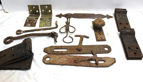This product is a lot of vintage and antique reclaimed salvage hardware, including hinges, hooks, and more. The items are authentic pieces from the United States, showcasing traditional antique style. The dimensions of the items vary, reflecting the unique and rustic charm of the pieces. Perfect for adding a touch of history and character to furniture or decorative items, this lot is ideal for those looking to incorporate vintage elements into their home or projects.