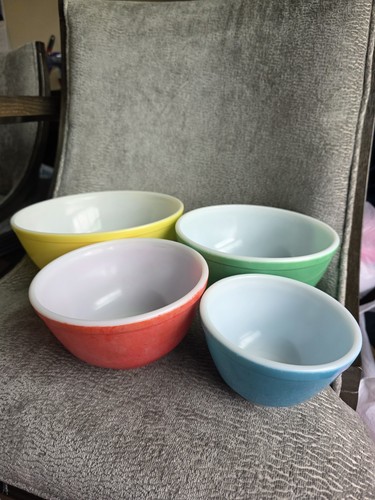 The Vintage 1950's PYREX Primary Colors Nesting Mixing Bowl Set Of Four is a charming collection of mid-century modern nesting bowls, perfect for all occasions. Made in America, these round bowls feature a glossy finish and decorative multicolor patterns, adding a retro touch to your kitchen. With a production style of milk glass and a stackable design, these mixing bowls are both practical and stylish. This original PYREX set is a nostalgic gem from the 1950s, ideal for adding a vintage flair to your cooking space. They are a little worn from everyday use. But there is no chips or cracks!!!