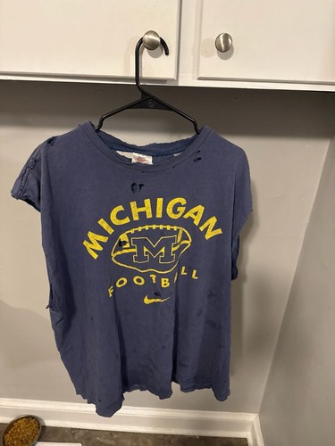 Vintage 90s Nike Michigan Football t-shirt. Heavily thrashed aesthetic with multiple holes and distressing. Sleeves are cut off for a muscle tank style. Faded navy blue color with yellow screen print graphics. Michigan Football logo and Nike swoosh on front and back. Made in USA on a white Nike tag. Size XL fits true to vintage boxy style.