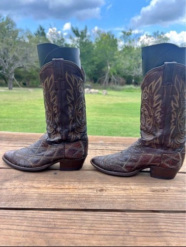 These genuine sea turtle boots by Justin Boots are a stylish and unique choice for male equestrians. These western-inspired riding boots in US size 9.5 feature a sea turtle leather that sets them apart from traditional black or brown boots. The brand's reputation for quality craftsmanship and durability ensures that these boots are not only fashionable but also functional for outdoor sports and equestrian activities. Boots have some imperfections at stichlines and where leather meets foot, some scrathes and inside shaft is peeling slightly