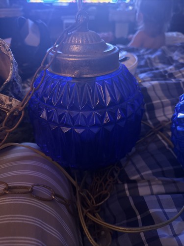 This vintage MCM 60s/70s Blue Bubble Glass Swag Lamp Hanging Light is a unique and stylish addition to any indoor space. With a corded electric power source and easy installation features, this original 1960s piece is perfect for all occasions. The blue glass shade in a globe shape adds a whimsical touch to the 60's MCM style, while the hanging design makes it a versatile choice for any room. Made in the United States, this swag lamp is a true collectible item that adds character and charm to your decor.