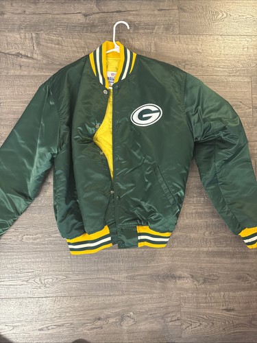 This Vintage Green Bay Packers Starter Satin Jacket is an officially licensed NFL product in the iconic team colors of green and gold. Made by Starter, this jacket represents the beloved Green Bay Packers in a stylish and classic design. Perfect for football fans looking to show their support during the regular season, this jacket is a must-have for any die-hard Packers supporter. Made in South Korea, this men's jacket in size large is a timeless piece of fan apparel.