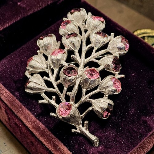 This vintage Sarah Coventry brooch features pink and purple rhinestones in a silver-tone floral design. A timeless accessory for elegant vintage charm. • Silver-tone metal construction • Pink and purple glass rhinestones • Floral-inspired design • Measures approximately 2" x 2.75" • Pin clasp closure for secure wear No visible flaws or damage noted. Measurements: Approximately 2" x 2.75". Features: • floral • All season • textured • Clean with a soft cloth Size: 2"x2.75" Condition: Pre-Owned Like New No visible flaws noted.