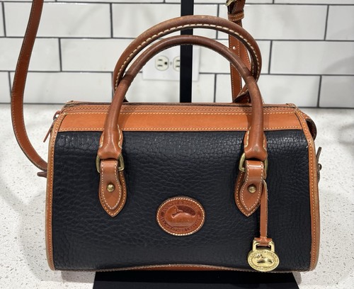 Vintage Dooney & Bourke R710 Small Black Leather Satchel with Shoulder Strap *Very Good Vintage Used Condition *Darkening or patina noted on handles *Wear noted on corners *Clean interior *Solid Brass Hardware *Brass Duck Fob/Charm *Refer to photos for description and condition *Please ask questions before purchasing. Thank you!