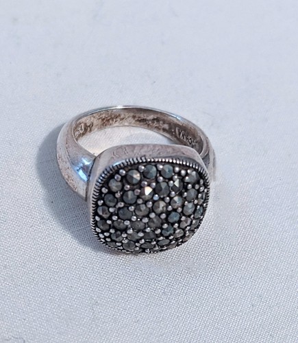 This vintage style cocktail ring is crafted from sterling silver with a pavé setting featuring marcasite crystal. The ring is signed with a capital A and is a size 7. The unique combination of materials and design make it a standout accessory for those who appreciate vintage jewelry with a touch of elegance.