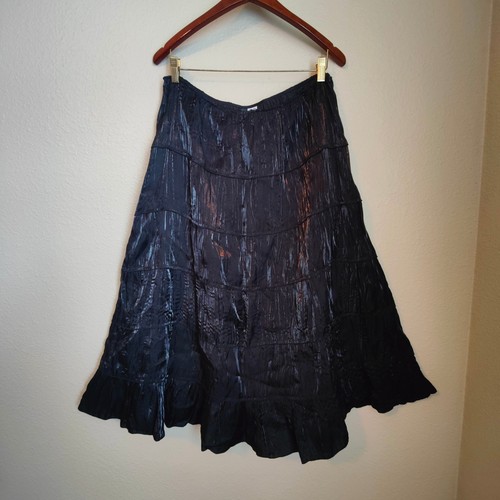 Studio 1940. 75% rayon, 25% polyester. Side zip closure. Iridescent black color. Excellent pre-owned condition. Tagged a Womens US 16 Approx. Measurements: 17"waist 24" hip 32" length casual, everyday, going out, date night, concert, events, iridescent, grunge, fairy, whimsigoth, boho, bohemian, tiered maxi, vintage, y2k, ruffle #fairygrungeskirt #tieredmaxiskirt #shinymetallic #bohemian #whimsygoth