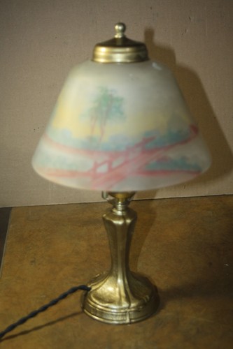 Nice vintage brass tone 3 way metal desk or table lamp - not brass but painted in a brass tone. Has a new socket and cord. Light works fine in all 3 positions. Lamp measures 14" to top of harp. 4" across the base. Nice heavy reverse painted frosted glass shade with a country scene - bridge and farmhouse and trees. Shade measures 8" in diameter at the opening and 5" tall. Free shipping to lower 48