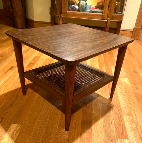 This Mid Century Modern 1966 Lane Walnut Side Table is a rare find with a unique woven cane shelf. Top is 18-19" square, and the table stands 15.25" high.