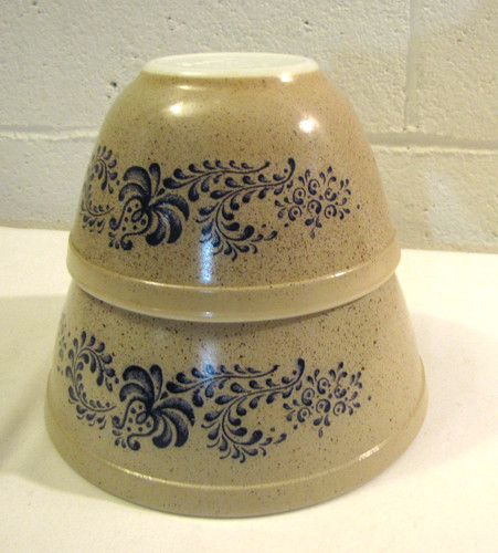 This is a pair of Pyrex mixing bowls in the Homestead pattern. Light wear present and one very small chip on the rim of the small bowl. Bowls 401 (750ml) 402 (1 1/2 quart, 1.5 liter) included.