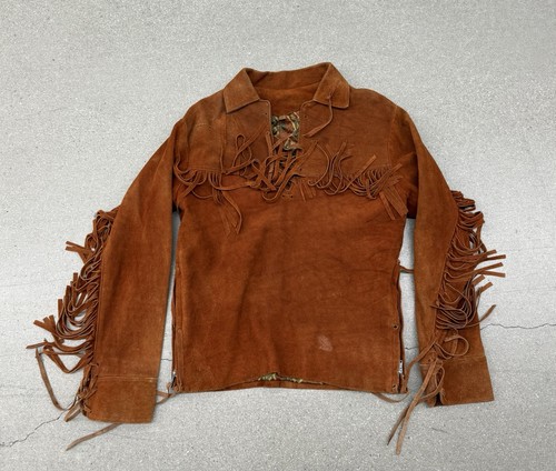 This True Vintage 50's Men's Tan Western Leather Fringe Jacket is a stylish and classic piece for any man's wardrobe. Made in the USA, this jacket features a zip closure, lined interior, and fringe accents, giving it a unique and western-inspired look. The mid-length overcoat style is perfect for casual occasions during the winter, fall, and spring seasons. With a chest size of 38 inches and a regular fit, this jacket is sure to provide both comfort and style for any man looking to add a touch of vintage flair to their outfit.