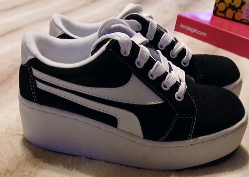 The product is a pair of Women's Vintage Platform Tennis Shoes by the brand Coasters in size 7. These athletic sneakers feature a black and white color scheme with a standard shoe width and leather upper material. Perfect for adding a touch of retro style to your workout routine or casual outfit, these platform tennis shoes offer both fashion and functionality.