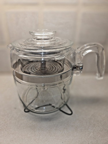This original stainless steel and glass set includes a percolator basket, lid, and handles, making it a complete and collectible addition to any kitchen. The glossy clear finish, along with its retro design, adds a touch of nostalgia to your tea and coffee brewing experience.