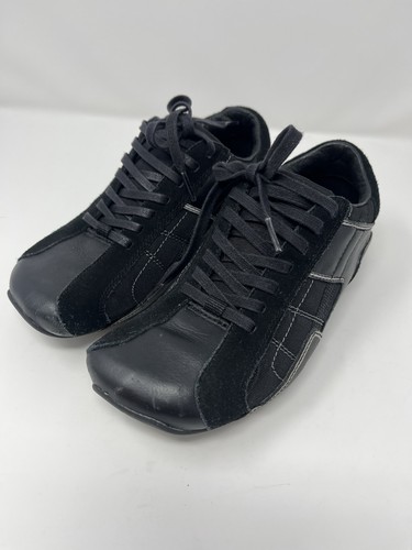 These black square toe sneakers feature a leather upper and embody a retro Y2K style.