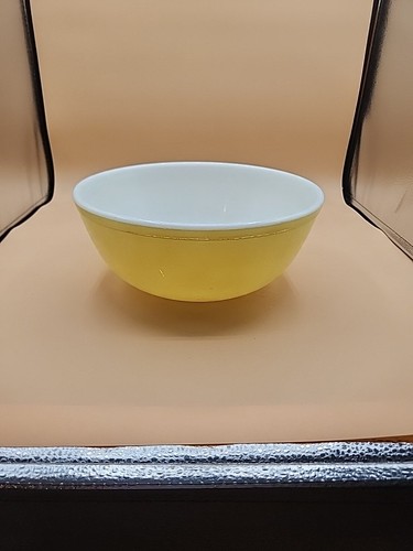 Some blemishes in yellow paint but they are small. No chips. My research indicates this dates to the 50s. Bottom reads: 404 TRADE MARK 11 PYREX R (circled) MADE IN U.S.A. OVENWARE