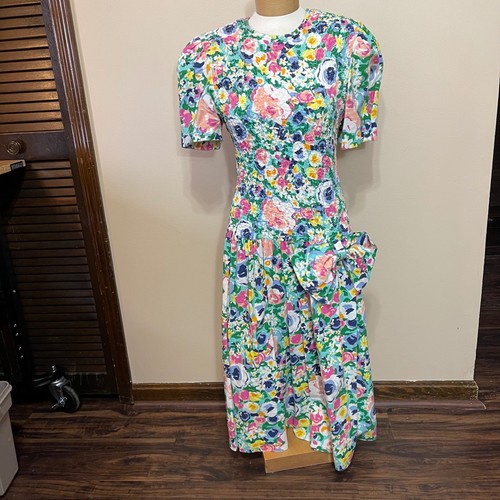 Made in the USA, this piece perfectly captures the bold femininity of the 1980s. Features: Smocked Bodice, Puff Sleeves, Hip Bow. • Pit to Pit: 15" (30" doubled) - stretches to approx 18" (36" doubled).