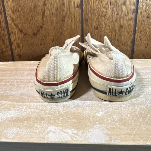 These sneakers came from the Converse factory in Rhode Island. They came in a box of factory defect sneakers. They have never been worn. There is defects on the front and on the side area of the right shoe. Because they were factory defects that’s why the converse is blacked out on the inside and that’s why it is rubbed off on the bottom sole.. Sold as is and as shown in photographs
