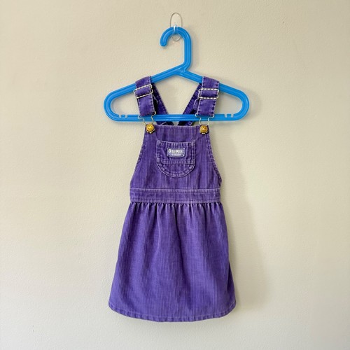 Super cute vintage girls overall dress in purple wide wale corduroy. Cross cross back straps, front patch pocket, elastic waist in back. Made in the USA. Great condition! Tagged a 4T, see measurements: Waist laying flat (unstretched) - 9" Shoulder to hem (max) - 22"
