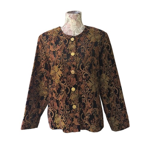 Jones New York Collection Studio jacquard button front blazer in a size 18. This elegant piece showcases a rich tapestry-like pattern in warm earth tones. Its classic silhouette makes it a versatile addition to your wardrobe, perfect for a sophisticated office ensemble or a refined evening out.