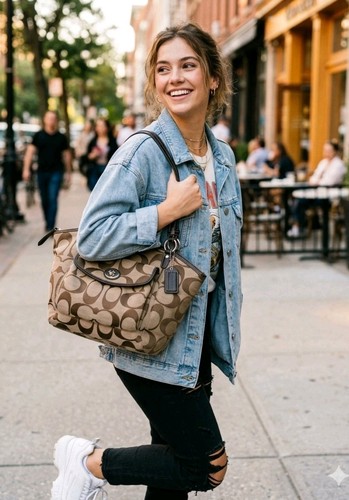 Coach Leah Signature Shoulder Tote (Style #F14659). Featuring the iconic khaki and brown "C" monogram jacquard canvas, this bag is accented with high-shine brownpatent leather trim and polished silver-tone hardware.