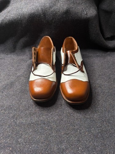 Vintage Edwards Leather Saddle Shoes, Brown and White, Size 3D — Classic retro style. These vintage oxfords feature a timeless two-tone brown and white leather upper with brass eyelets and Goodyear Wingfoot rubber heels. Perfect for collectors or a retro-inspired look. Good pre-owned condition. Outsoles show very little wear. There are minor faint spots on the white leather panels and some light cracking near the heel stack as pictured. These are a vintage size 3D, generally fitting a youth or small adult/women's equivalent.
