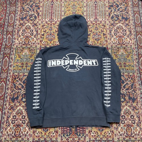 Independent Truck Co. zip-up hoodie in a classic black colorway. This skate staple features the iconic cross logo large on the back and repeated down both sleeves in a bold white print. Constructed with a full-zip front, drawstring hood, and split kangaroo pockets, it offers a timeless streetwear silhouette. Note some light wear including a small spot on the sleeve and minor fraying near the collar as shown in photos. Keywords: Skater, Streetwear, Grunge, Y2K, Punk, Goth, Alt, Skateboarding, Graphic Hoodie, Oversized, Casual, Edgy, Retro, 90s, Urban