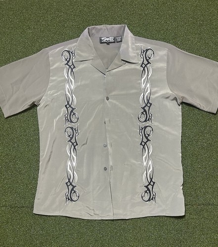 The Vintage Dragonfly Clothing Co Short Sleeve Button Down Shirt in size XL features an embroidered tribal pattern on a gray polyester fabric. This lightweight shirt is perfect for all seasons, especially summer, fall, and spring. With a collared neckline, button closure, and regular fit, this shirt is machine washable and accented with embroidered details. Perfect for men looking for a casual yet stylish addition to their wardrobe, this button-up shirt from Dragonfly is a unique and versatile piece.