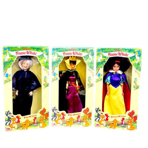 • The Witch character with dark cloak and hood. • The Evil Queen with crown and royal purple attire. • Snow White featuring signature yellow and blue gown. • Includes three classic characters from the beloved film.