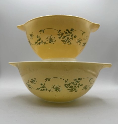 Set Of 2 Pyrex Vintage Shenandoah Cinderella Mixing Bowls 443 and 441 in used condition there is ware present on inside and outside of bowls there are black utensil marks on the outside of the bowl PLEASE SEE ALL PHOTOS small bowl width 7 1/2 inches with handles big bowl width 9 1/4 inches with handles weight 2 lbs 8.9 oz