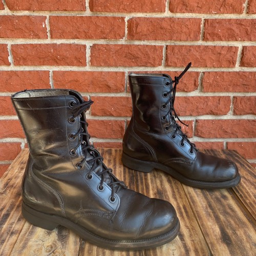 The interior is stamped with size markings, indicating a robust construction typical of mid-century service footwear and are crafted from durable black leather. Sole: Biltrite Rubber. Heel: B.F. Goodrich.