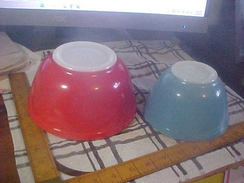 VINTAGE PYREX NESTING MIXING BOWL PRIMARY RED AND BLUE USED BUT STILL NICE CONDITION.