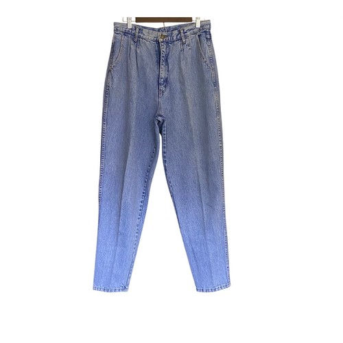 Style: Pleated Tapered Leg. Color: Light Wash Blue. Rise: High Rise.
