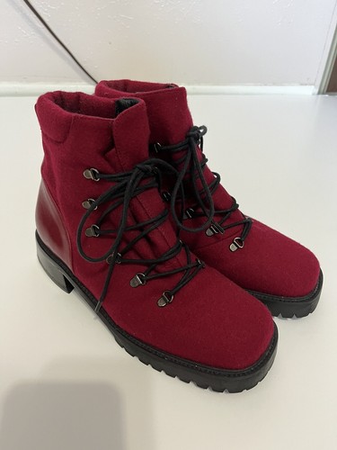 Stuart Weitzman Wine Red Wool Leather Vintage 90s Lace-up Combat Boots Womens size 5.5 Wool with leather on back Chunky block heel Overlapping tongue Lining material inside has started to crumble due to age A few minor scuffs on heel pictured Great condition NO RETURNS Tags: Vintage, 90’s Fashion, Combat Boots, Leather, Wool, Chunky, Y2K