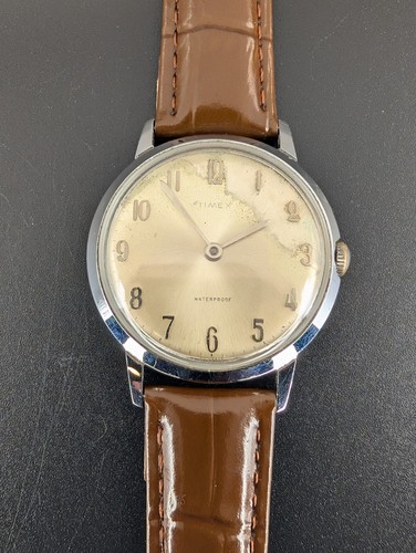 The Timex Marlin Vintage Watch is a stylish timepiece with a classic design featuring a chrome-plated case and a patina dial. This unisex wristwatch has a silver bezel and dial, complemented by a brand new brown leather band for a sophisticated look. The mechanical manual movement winds, sets, and keeps accurate timekeeping. Perfect for dress/formal occasions or everyday wear, this vintage watch is a timeless piece that exudes a combination of retro charm and modern style.