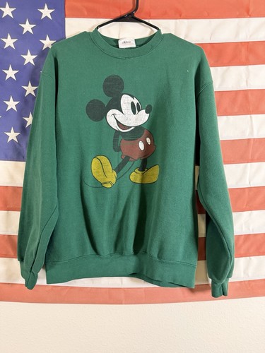 The Disney Mickey Mouse Vintage Crewneck Sweatshirt in size large features a classic white color with the iconic Mickey Mouse character graphic print. Made from soft cotton material, this regular fit sweatshirt is perfect for the winter, fall, and spring seasons. With a crew neck and long sleeves, this pullover sweatshirt is machine washable for easy care and is officially licensed by Disney. Show off your love for the beloved Mickey Mouse character with this vintage-inspired sweatshirt.