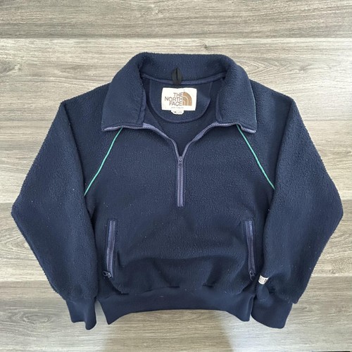 Vintage North Face Pullover Mens Medium Navy Blue Fleece Made in USA 90s Condition: Good – light wear with some minor pilling and faint lint, no major flaws Poly fleece construction with classic North Face embroidered patch at the collar Half zip front with stand collar Two zippered hand pockets at front Ribbed cuffs and hem for a snug fit Green piping accent along shoulders and sleeves Tag size: Medium (Mens) Made in the USA Era: Likely early to mid 90s based on label style Classic outdoors fleece ready for hiking, camping, or casual style