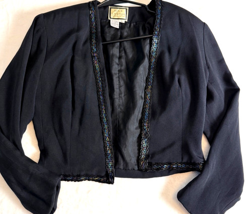 Made from 100% silk with fully lined interior. Features open front design with decorative beaded trim along edges and hem, giving it a formal or eveningwear look.
