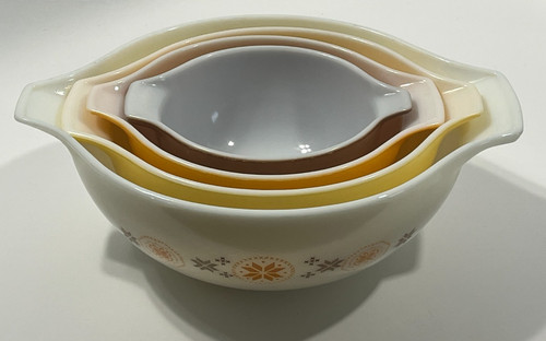 Perfect for all occasions, these stackable, oven-safe, and refrigerator-safe bowls are a charming addition to any kitchen décor. The set includes four bowls (441, 442, 443, 444) that are sure to bring a touch of retro style to your cooking and baking experience.