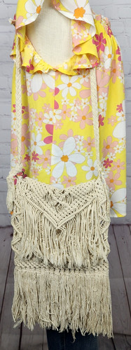 Made with ivory cotton and featuring intricate crochet detailing and fringe accents, this purse exudes a coastal cowgirl vibe. Strap Length: 18.5". Color: Ivory. Depth.5" lying flat. Minimal wear to exterior and interior.