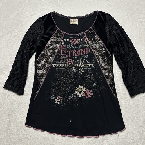 Stunning Vintage Edista Mixed-Media Top Capture the ultimate early 2000s aesthetic with this rare Edista graphic top. This piece features a unique patchwork design combining soft velour, textured sleeves, and a "The Strand" floral graphic. Aesthetic: Perfect for Y2K, McBling, Fairy Grunge, or Whimsigoth styles. Details: Contrast pink lettuce-edge stitching, sheer textured sleeves, and a flattering boat neck. Condition: Excellent vintage condition. Material: Mixed textures (Cotton/Velour/Lace). Origin: Made in USA.