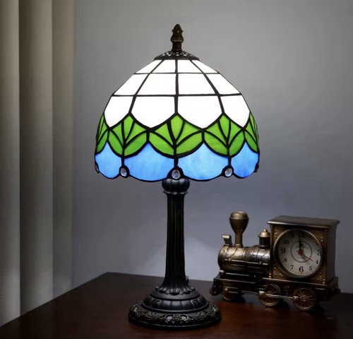 Classic Tiffany Design – Clean stained glass pattern with soft color accents. Durable Construction – Sturdy resin base with real glass shade panels. Material: Glass shade + resin base.