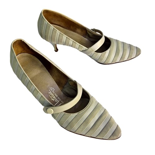 Item is cross listed on multiple sites / lots of viewers. Grab it now if you want it! Era: Late 1950s–early 1960s — pointed toe, slim heel profile, and snap-strap. Heel height: 3". - Material: Man-made upper in horizontal ribbon stripe, cellulose cushion insole, leather sole.