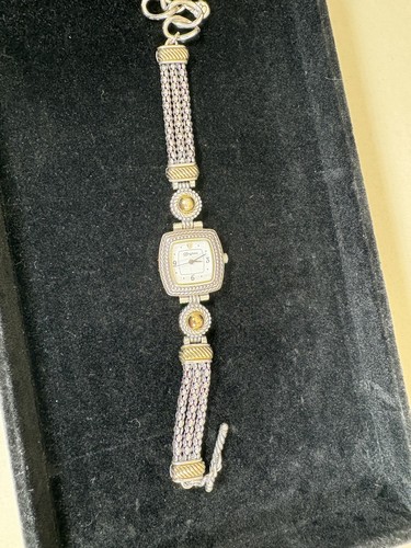 The Vintage Brighton Tuscany Watch features a classic design with a square case in silver plated material, adorned with round indexes and numbers on a white dial. The watch has a bracelet band with a toggle closure, adjustable up to 7-8" wrists. With a quartz movement and water resistance feature, this stylish timepiece is perfect for both dressy and casual occasions, embodying love and hearts theme through its elegant design. A timeless piece by Brighton, this wristwatch is a charming addition to any jewelry collection.