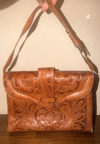 This Vintage Western Hand Tooled Leather Purse with a Floral Design is a unique and handmade accessory perfect for casual occasions. Made in Mexico, this medium-sized rectangle-shaped purse features a beautiful brown leather exterior with a floral pattern and Western theme. The purse has a zip closure, brown leather handle/strap, and inner pockets for organization. The leather lining and stamped/embossed finish add to the vintage charm of this stylish satchel/top handle bag, making it a timeless and personalized piece for any wardrobe. This is a vintage purse and shows signs of age and wear on the leather. There are dark spots on a couple parts of the purse and there lining has come through on the bottom left corner. Please see photos for reference.