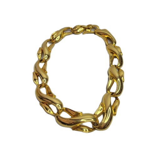 This vintage 80's gold tone chunky specialty link ultra large S link necklace features a bold chain style design in a striking gold color. The unique S link design gives it a distinctive and eye-catching look, perfect for adding a touch of retro flair to any outfit. Made with quality materials and attention to detail, this necklace is a stylish and versatile piece that can elevate any vintage or contemporary ensemble.