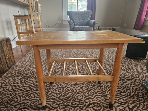 With its distinctive. First it was thoroughly cleaned. The finish was then removed. The piece was then resanded. A stain was supplied to give it a nice uniform color. Finally, three coats and four coats of oil based polyurethane war applied for a strong waterproof durable finish.