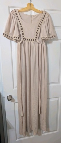 This piece features a classic empire waist silhouette with romantic lace and ribbon trim detailing along the bodice and sleeves. Likely 1970s era based on style and construction. Waist (empire): approx.