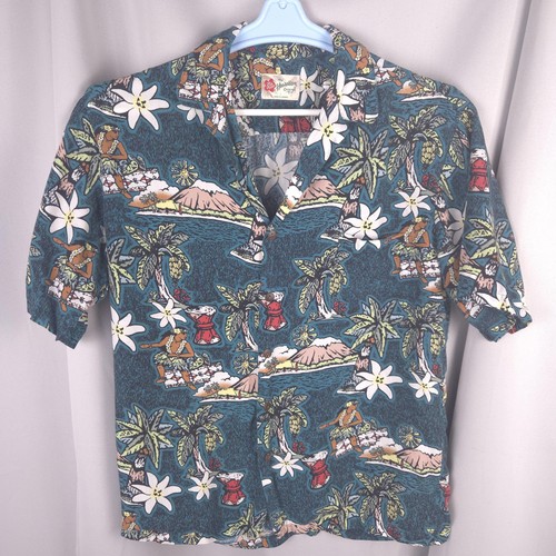 Classic short sleeve button-up in size L finished in a teal green island floral print. Top button missing. Light surface creasing and scattered fabric lint across the body, with a small loose thread at the front placket near a button; all coconut-style buttons present and functional; neck label intact; seams intact; no holes or repairs.
